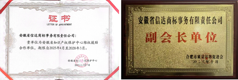 公司入选“中华商标协会人才与教育专业委员会”委员单位(安徽唯一),现为安徽省商标协会副会长单位、省商标协会代理机构专业委员会主任委员单位、安徽省海外知识产权纠纷应对指导合作机构,安徽省知识产权保护中心商标品牌指导站共建单位,合肥市质量品牌促进会副会长单位。