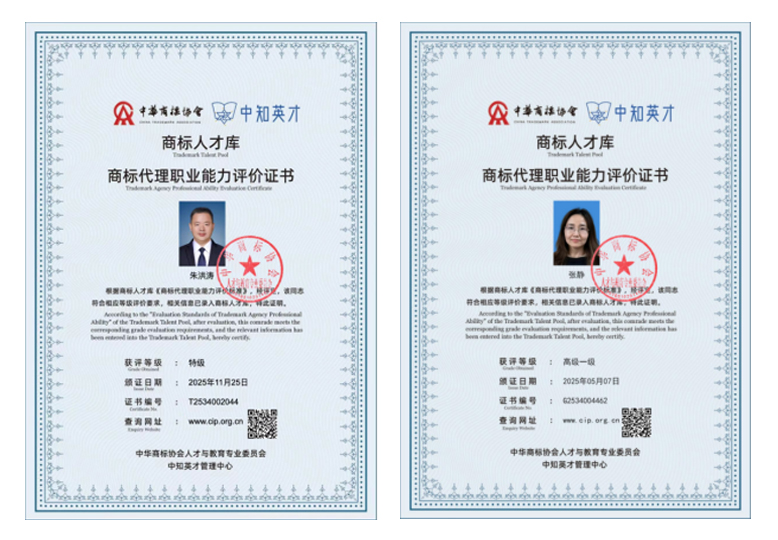 中华商标协会商标人才库“特级”人才朱洪涛、“高级一级”人才张静
