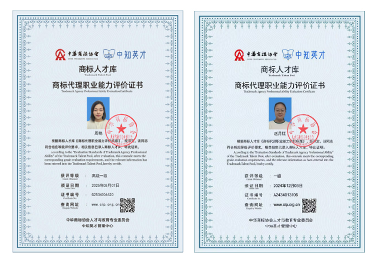 中华商标协会商标人才库“高级一级”人才周艳、“一级”人才赵月红