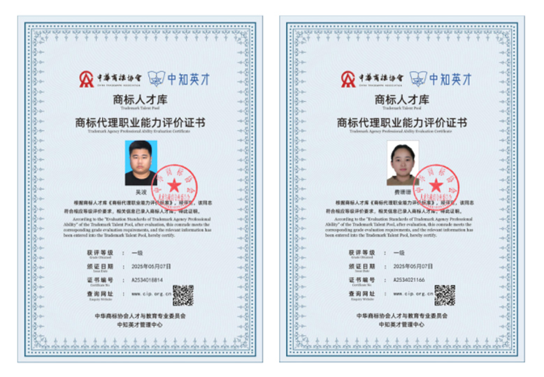 中华商标协会商标人才库“一级”人才吴波、“一级”人才费珊珊