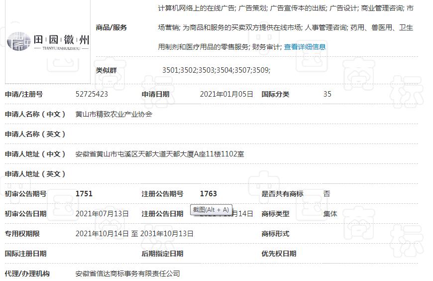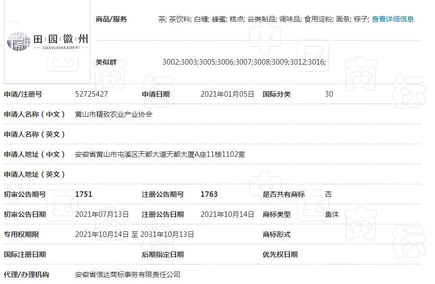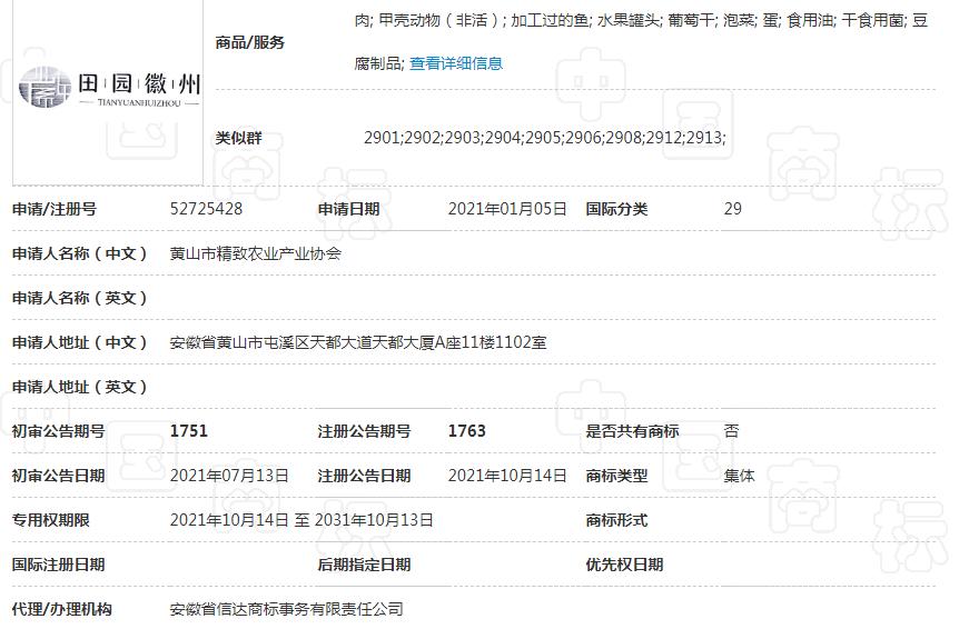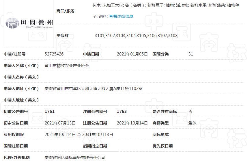 2021年10月14日,由黄山市精致农业产业协会委托安徽省信达商标事务有限责任公司代理的“田园徽州”集体商标获得国家商标局核准注册,这是黄山市委市政府倾心打造的首个绿色农产品区域公用品牌。