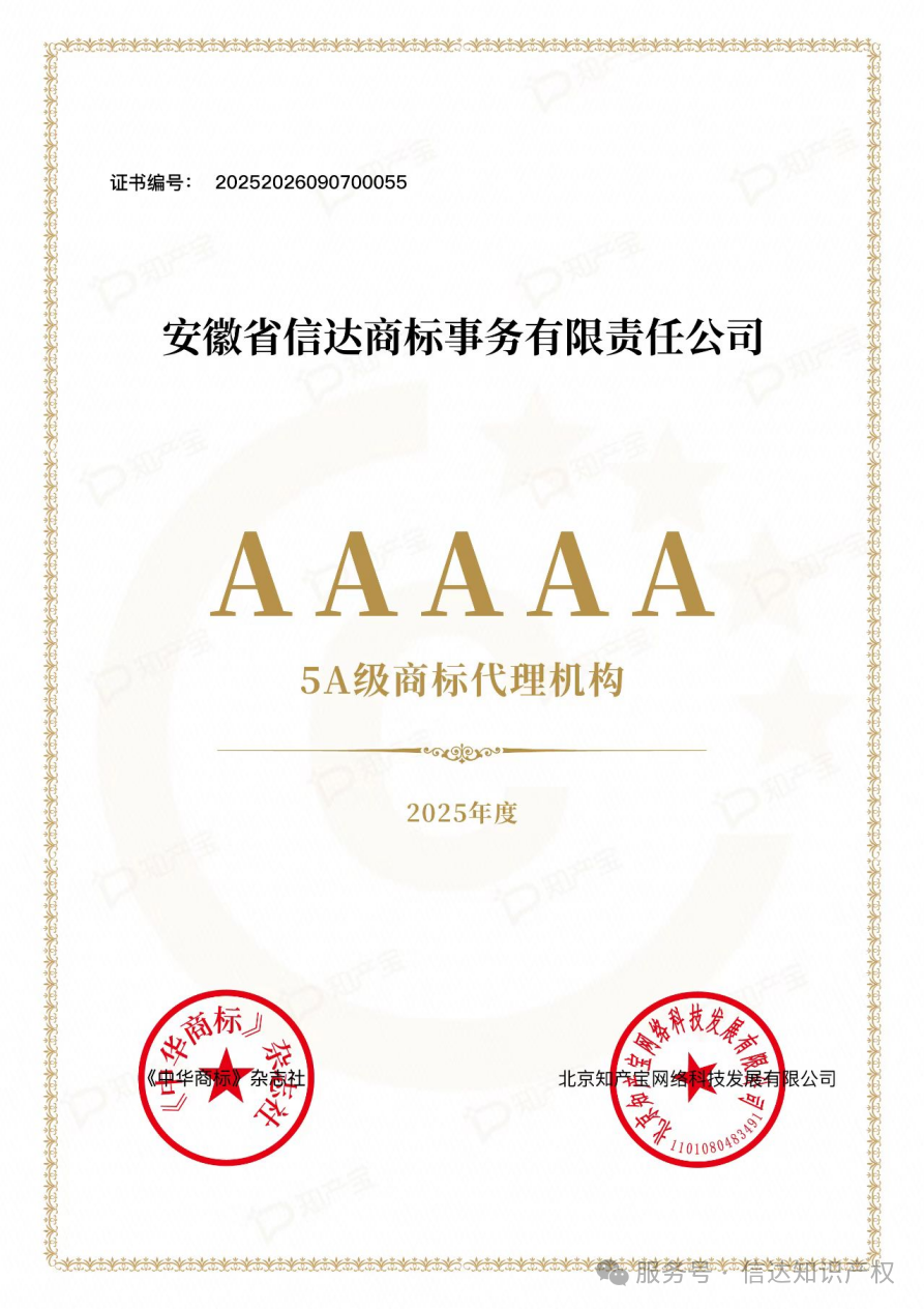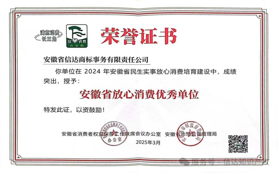 2025年,公司入选“中华商标协会人才与教育专业委员会”委员单位,也是安徽省首位且唯一入选单位;连续三年被中华商标协会评为安徽唯一全国“5A级商标代理机构”(TOP100);被安徽省市场监督管理局和安徽省消费者权益保护工作联席会议办公室评为“安徽省放心消费优秀单位”;被安徽省知识产权保护中心认定为“安徽省知识产权保护中心维权援助合作单位”;被安徽省中小企业协会评为“安徽省服务中小企业高质量发展重点服务机构”。